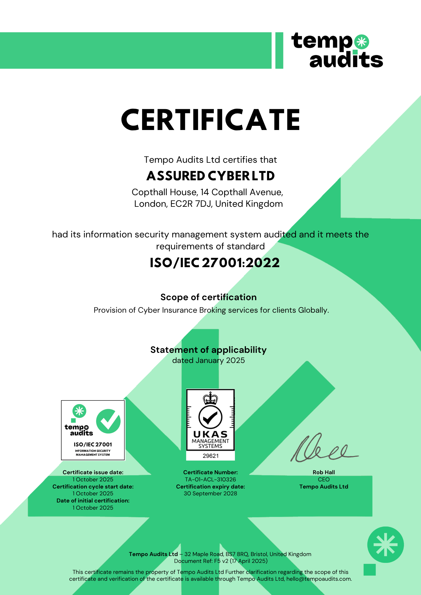Tempo Audits is proud to issue this ISO 27001 certificate to Assured Cyber Ltd!