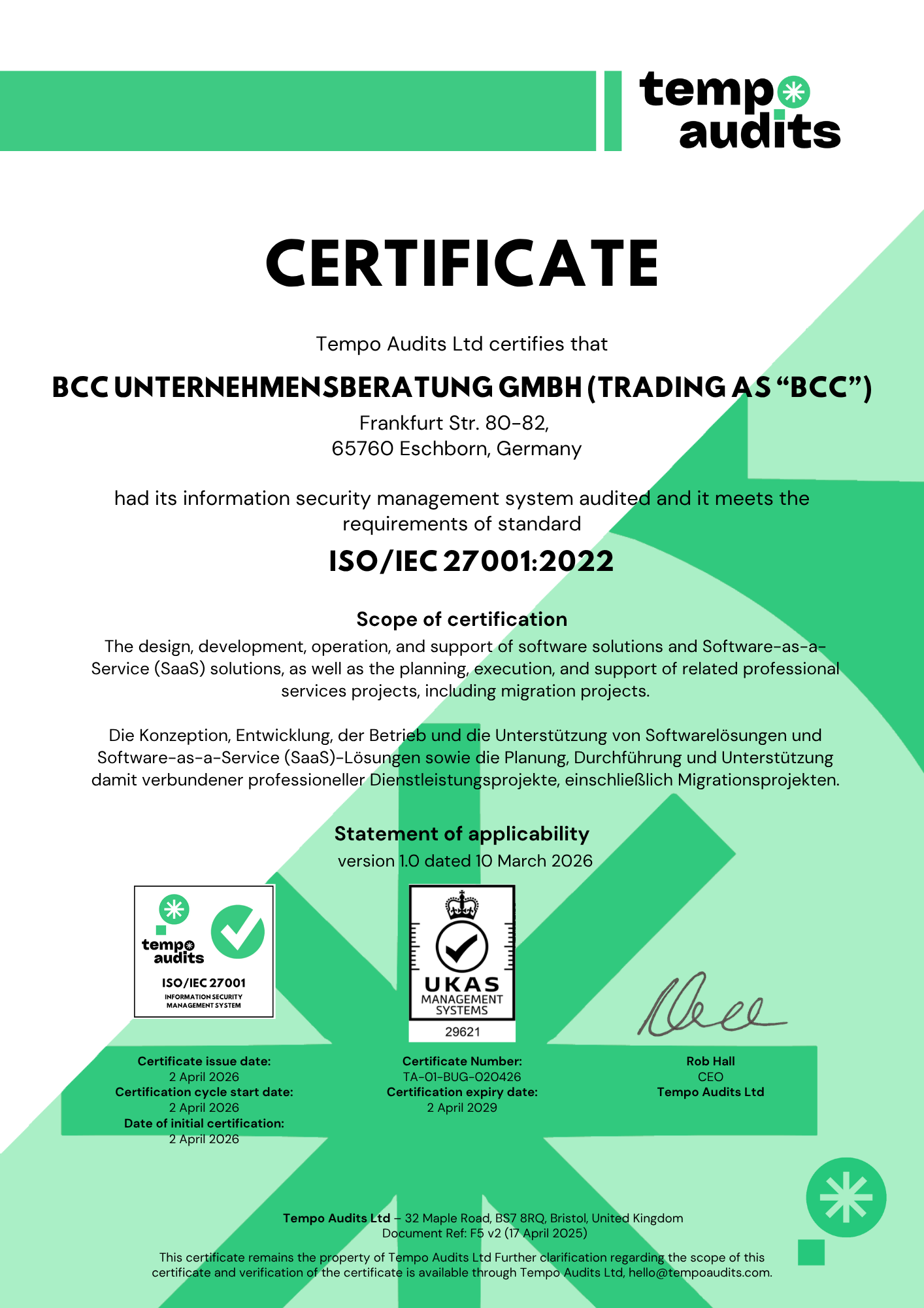BCC Unternehmensberatung GmbH / BCC Business Collaboration Company Ltd (trading as “BCC”) has successfully achieved their ISO 27001 certification, demonstrating their commitment to the highest standards of information security management. Tempo Audits is a UKAS-accredited ISO 27001 certification body, specialising in modern tech companies - we ensure that our clients meet the high standards required of them.