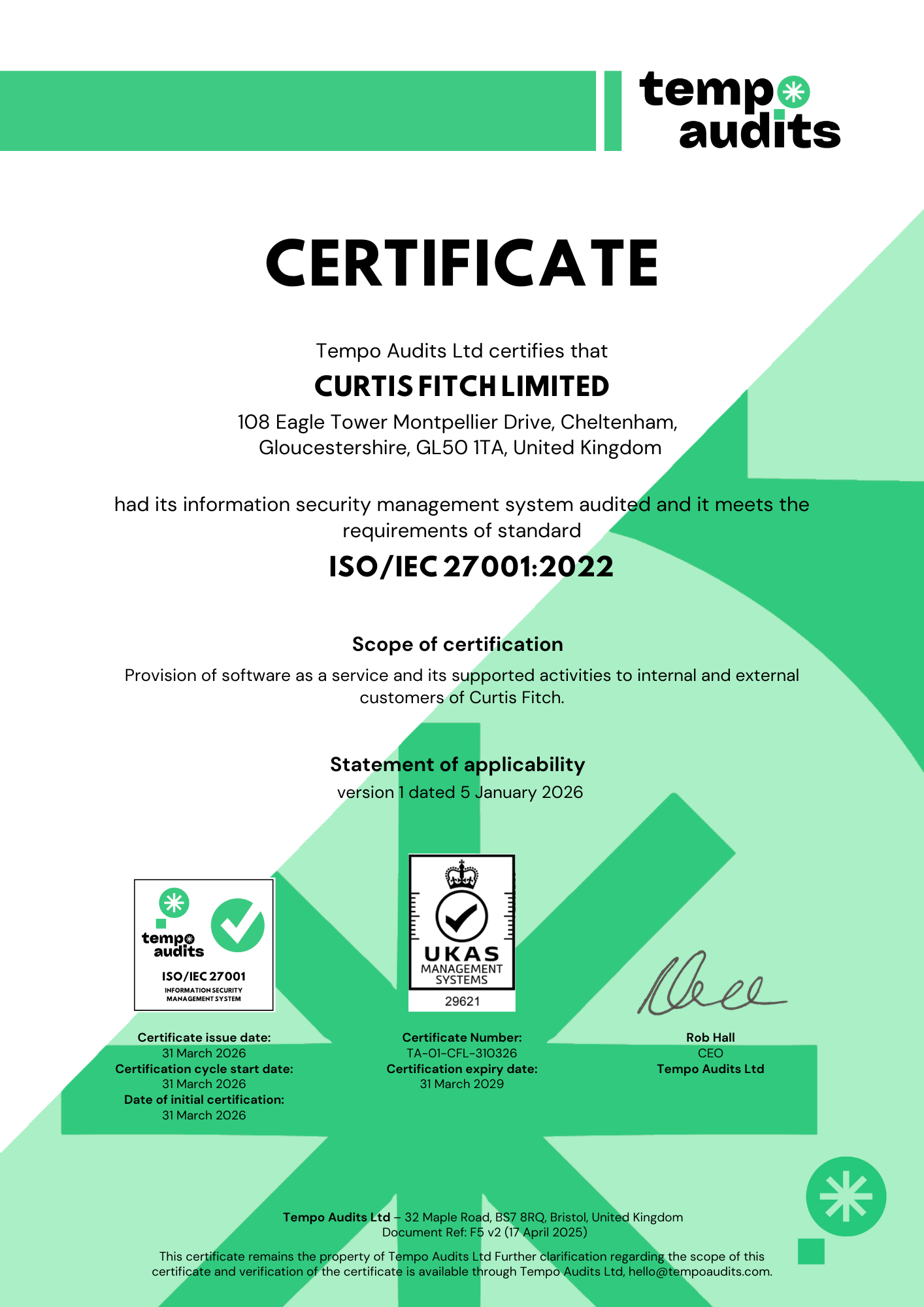 Curtis Fitch Limited has successfully achieved their ISO 27001 certification, demonstrating their commitment to the highest standards of information security management. Tempo Audits is a UKAS-accredited ISO 27001 certification body, specialising in modern tech companies - we ensure that our clients meet the high standards required of them.