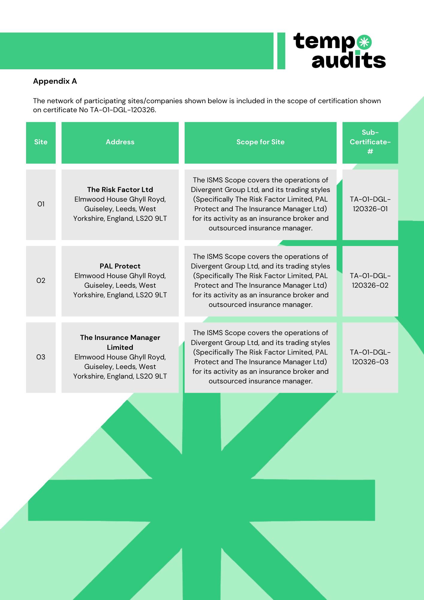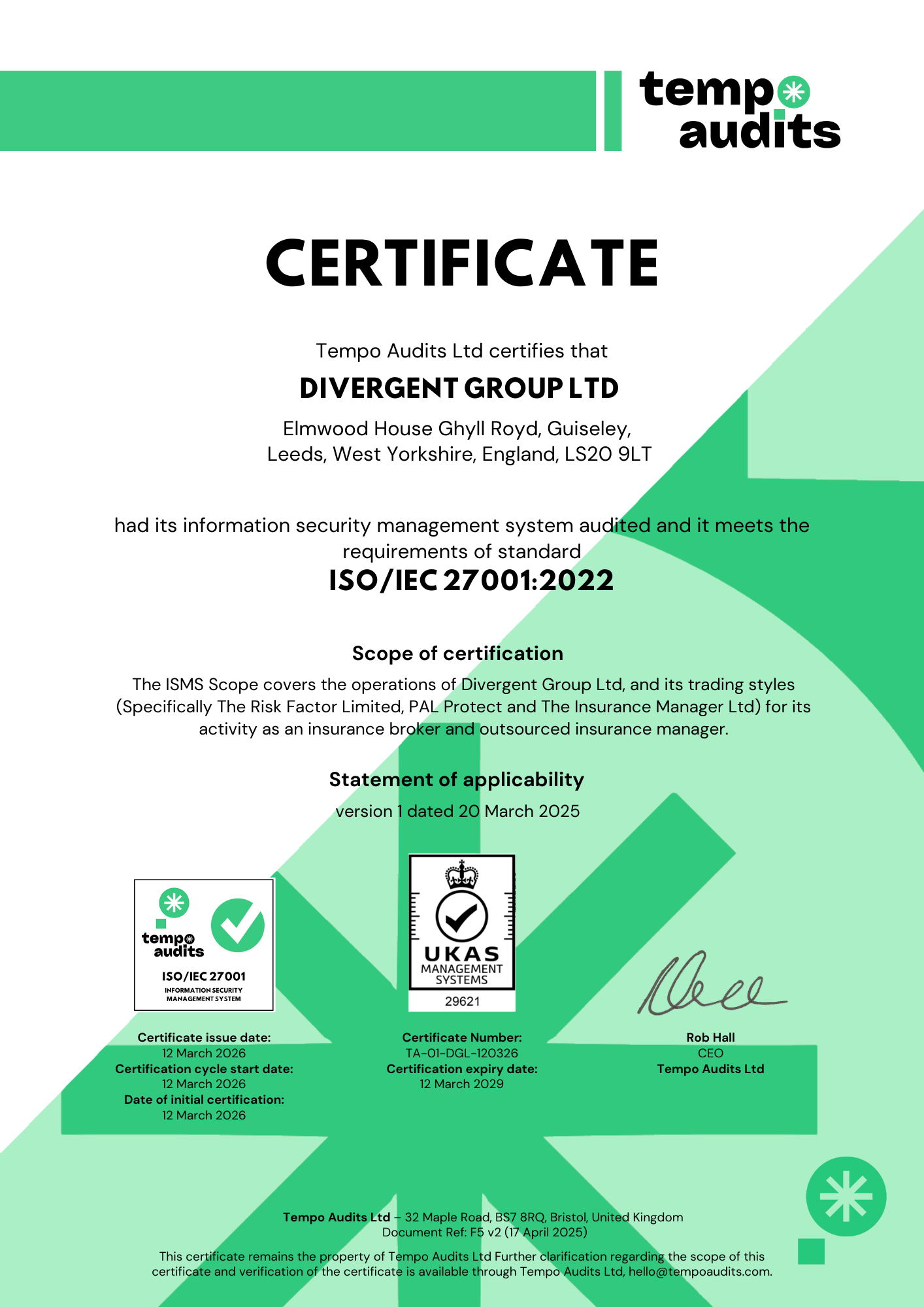 Divergent Group Ltd (The Risk Factor Ltd, PAL Protect, The Insurance Manager Limited) has successfully achieved their ISO 27001 certification, demonstrating their commitment to the highest standards of information security management. Tempo Audits is a UKAS-accredited ISO 27001 certification body, specialising in modern tech companies - we ensure that our clients meet the high standards required of them.