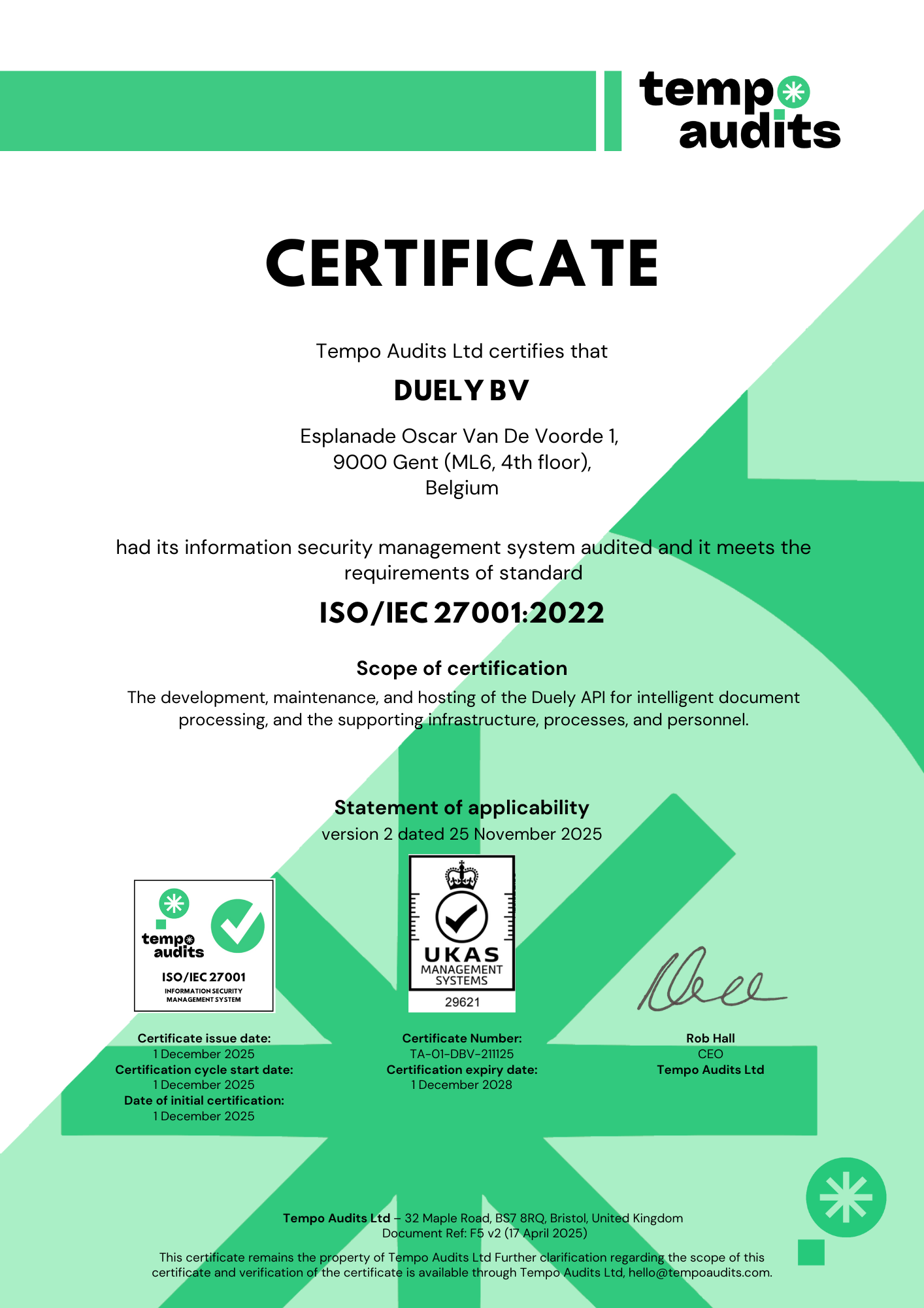 Duely BV has successfully achieved their ISO 27001 certification, demonstrating their commitment to the highest standards of information security management. Tempo Audits is a UKAS-accredited ISO 27001 certification body, specialising in modern tech companies - we ensure that our clients meet the high standards required of them.
