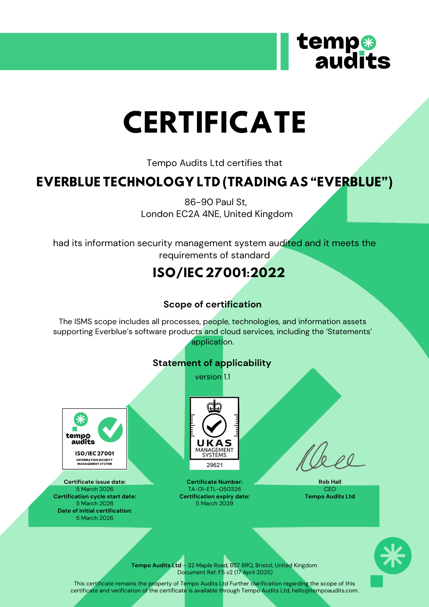 Everblue Technology Ltd (trading as “Everblue”) has successfully achieved their ISO 27001 certification, demonstrating their commitment to the highest standards of information security management. Tempo Audits is a UKAS-accredited ISO 27001 certification body, specialising in modern tech companies - we ensure that our clients meet the high standards required of them.