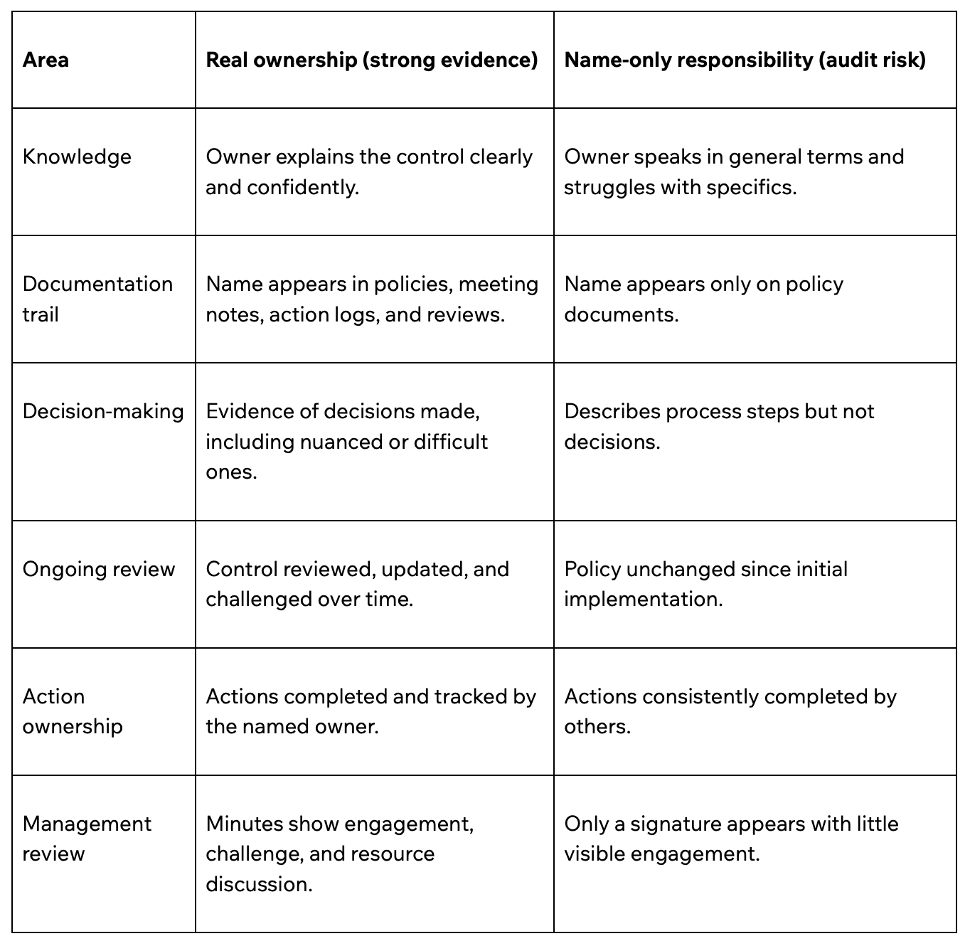 Auditors often test ownership through scenario-based questions. Genuine owners respond with judgment and decisions. Nominal owners tend to repeat documented procedures.