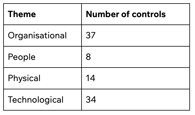 Under ISO/IEC 27001:2022, there are 93 controls, grouped into 4 themes: