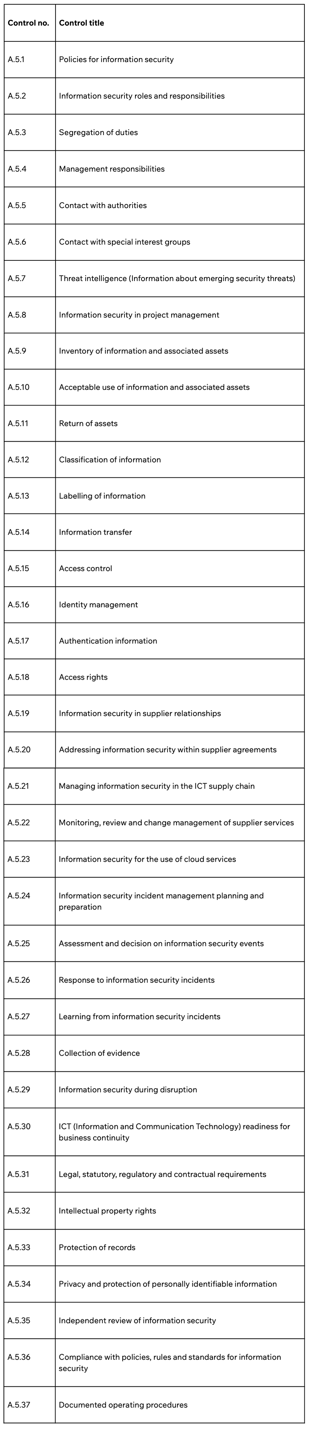 Annex A.5 – Organisational controls list