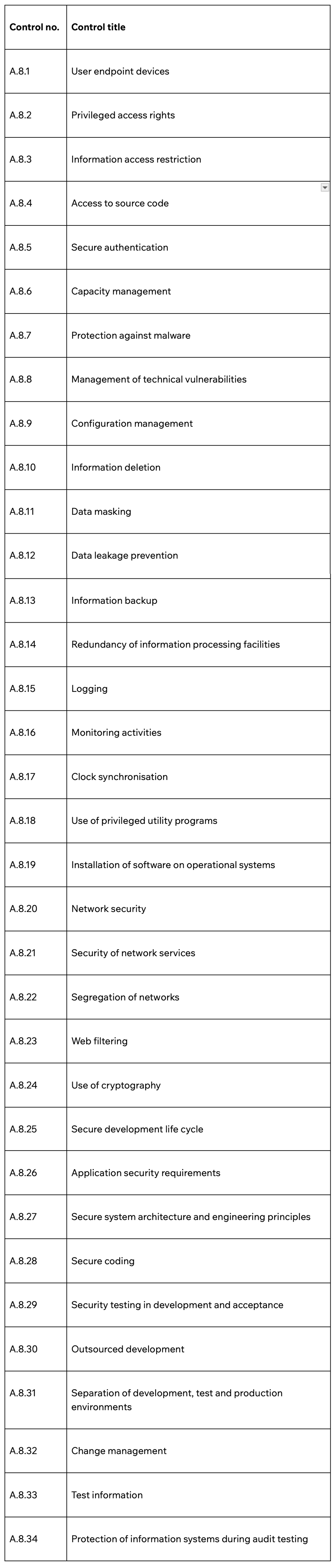 Annex A.8 - Technological controls list
