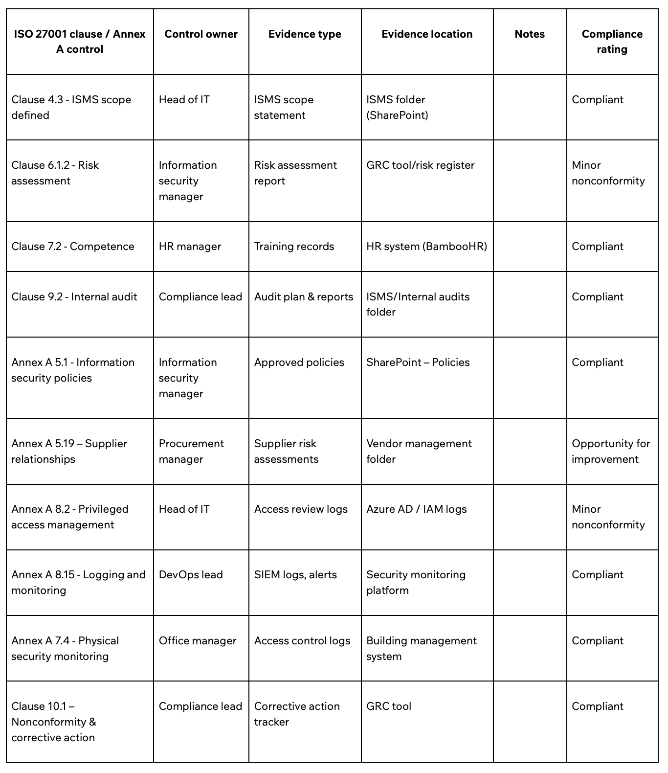 Collect screenshots, policy documents, meeting minutes, incident logs, and KPIs continuously. Store them in an access-controlled folder or wiki, or GRC platform, to simplify audit reviews.