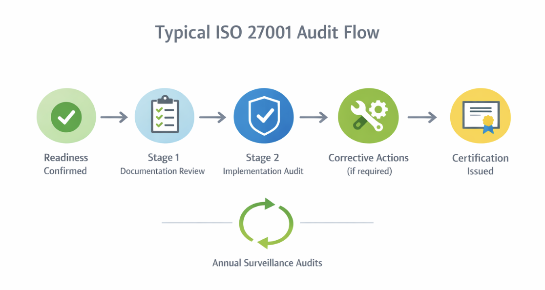 Certification follows a structured, evidence-based process. In the UK or Europe, this typically involves internal audits, a two-stage external audit, and ongoing surveillance by a UKAS-accredited or other accredited certification body