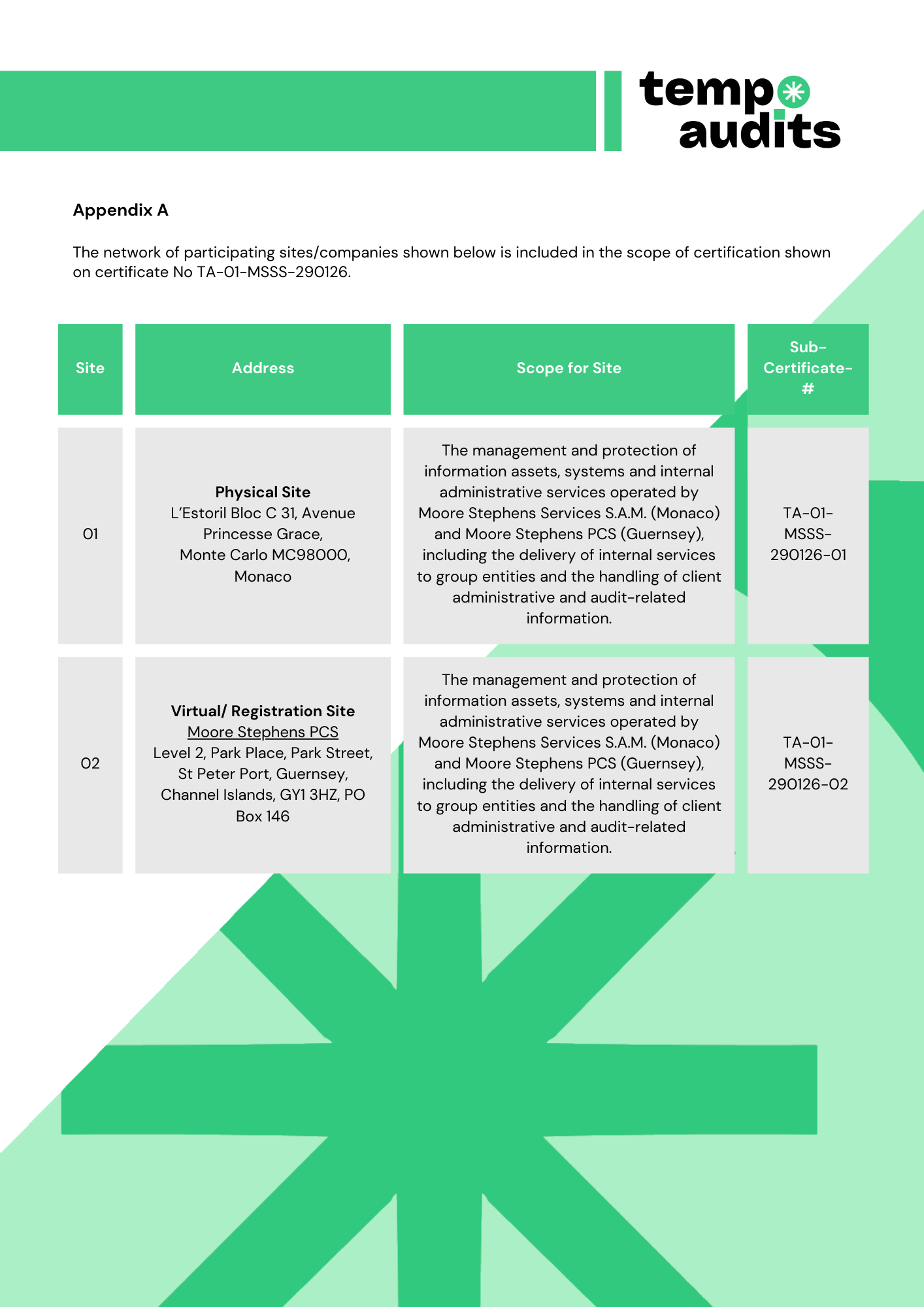 Moore Stephens Services S.A.M. (trading as “Moore Stephens”) has successfully achieved their ISO 27001 certification, demonstrating their commitment to the highest standards of information security management. Tempo Audits is a specialist ISO 27001 certification body, specialising in modern tech companies - we ensure that our clients meet the high standards required of them.