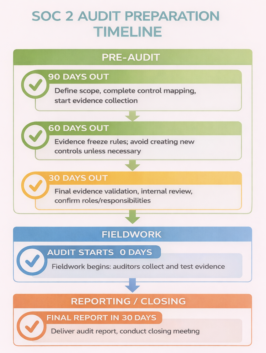 Structure and discipline reduce audit risk and delays. A clear preparation framework, realistic timeline, and role-based responsibilities help avoid common pitfalls, reduce exceptions, and result in a smoother, more predictable SOC 2 audit.