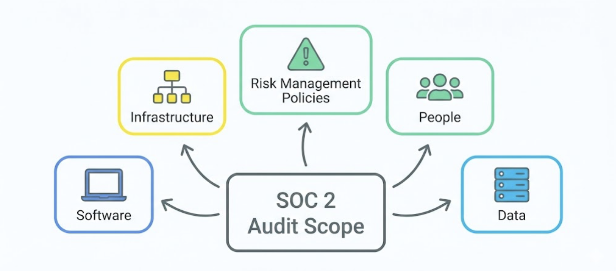 The audit is measured against the Trust Services Criteria. These include security, availability, processing integrity, confidentiality, and privacy. Each criterion focuses on a different aspect of how systems and data are managed.