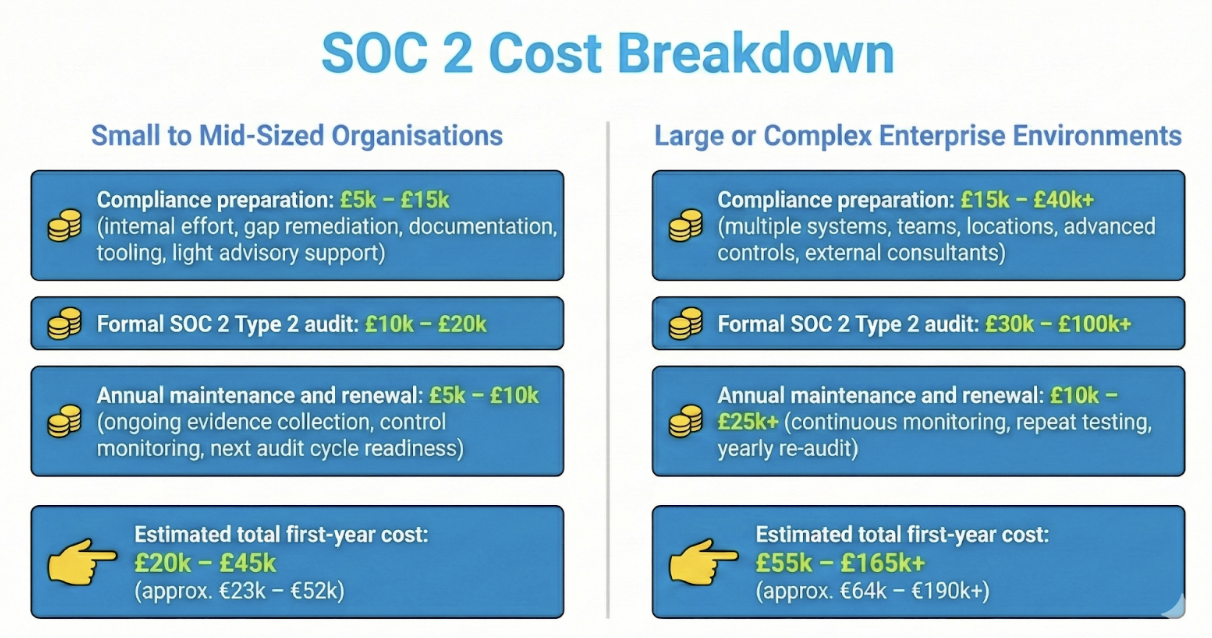 Costs often start at £30,000 and can exceed £100,000 (around €35,000 to €110,000+), depending on the number of systems, locations, and Trust Services Criteria in scope.