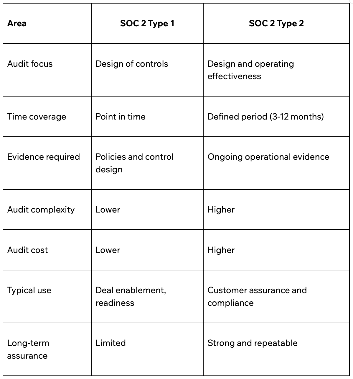 SOC 2 Type 1 vs SOC 2 Type 2: Comparison table